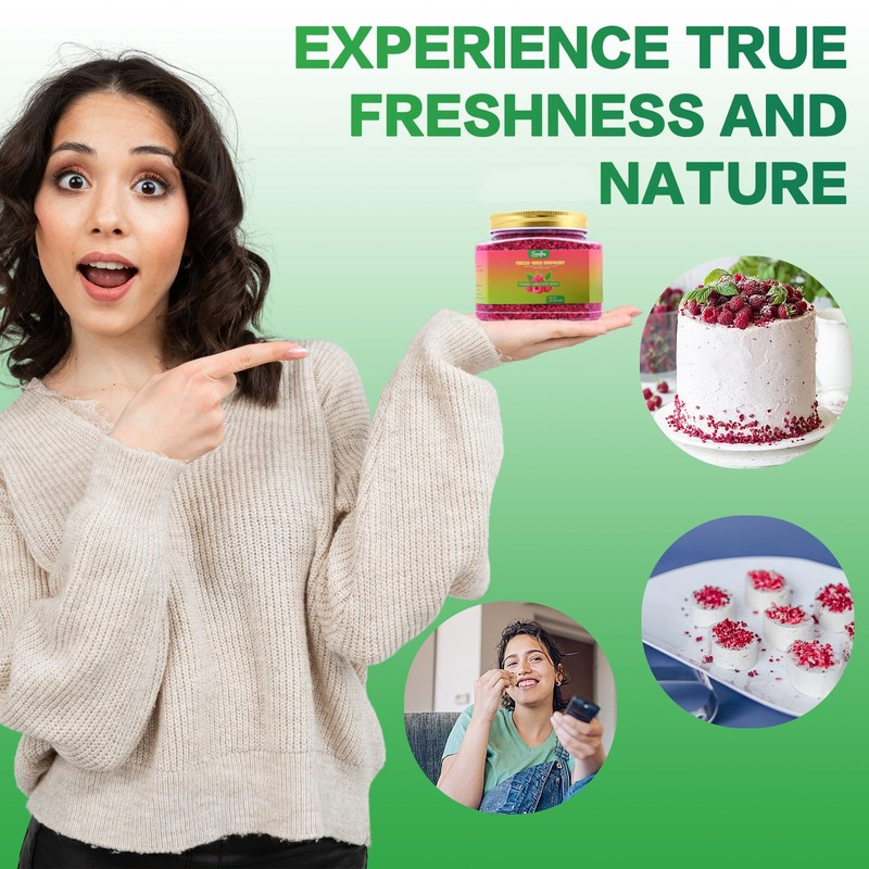 - 🥗100% Natural Freeze-Dried Raspberries: Our freeze-dried raspberries use freeze-drying technology to retain the natural nutrition, original flavor and delicious color of fresh raspberries. Each raspberry is strictly screened to ensure that there is no additives or sugar. Every bite you taste is a pure, natural fruit taste.