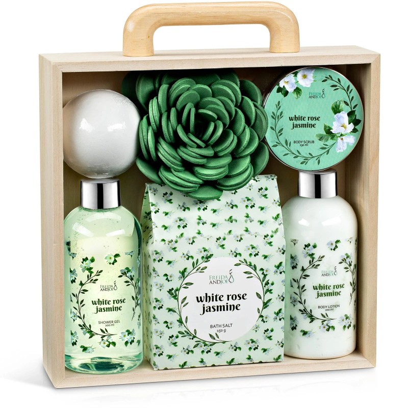 Deluxe White Rose Jasmine Spa Basket - 7pc Home Spa Set with Shower Gel, Body Lotion, Bath Salts, Body Scrub, Bath Bomb and Bath Puff in Wooden Curio