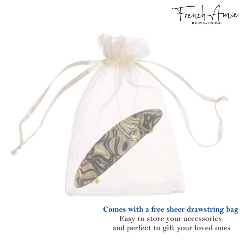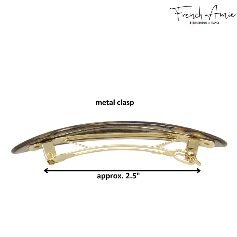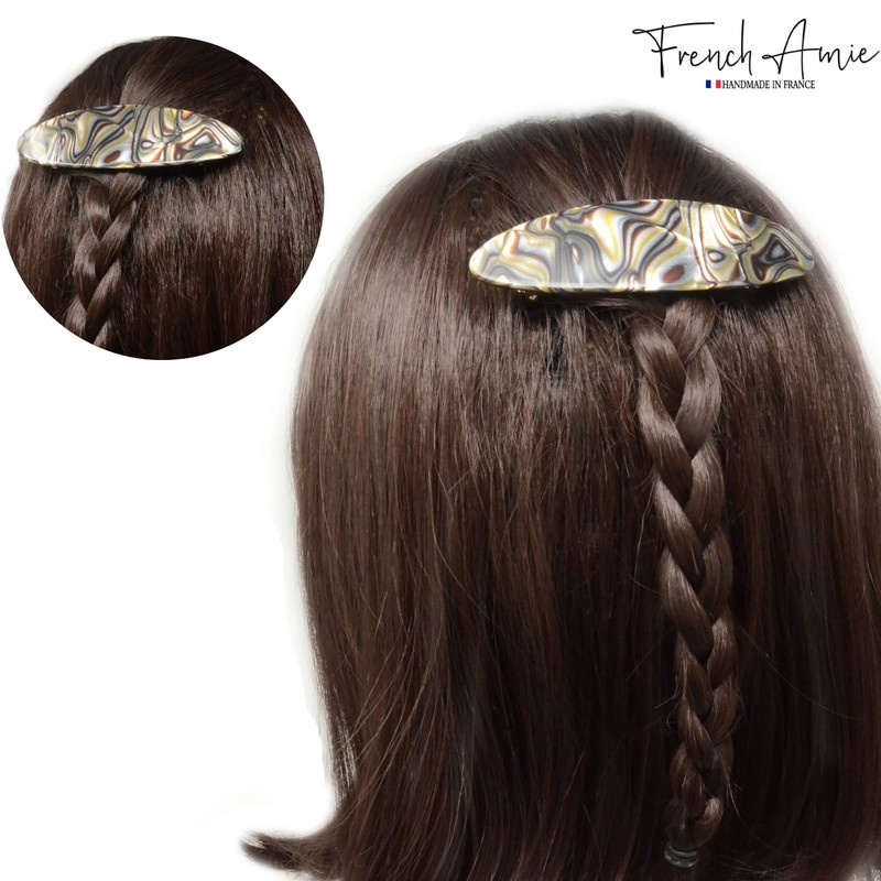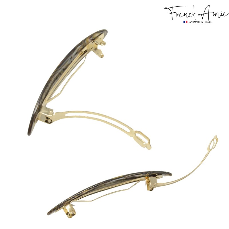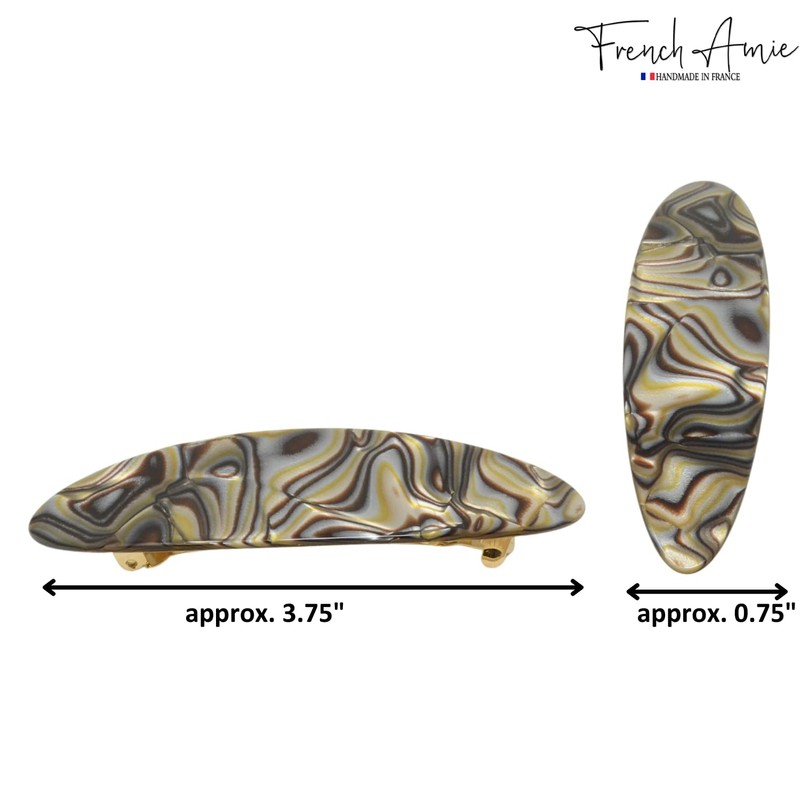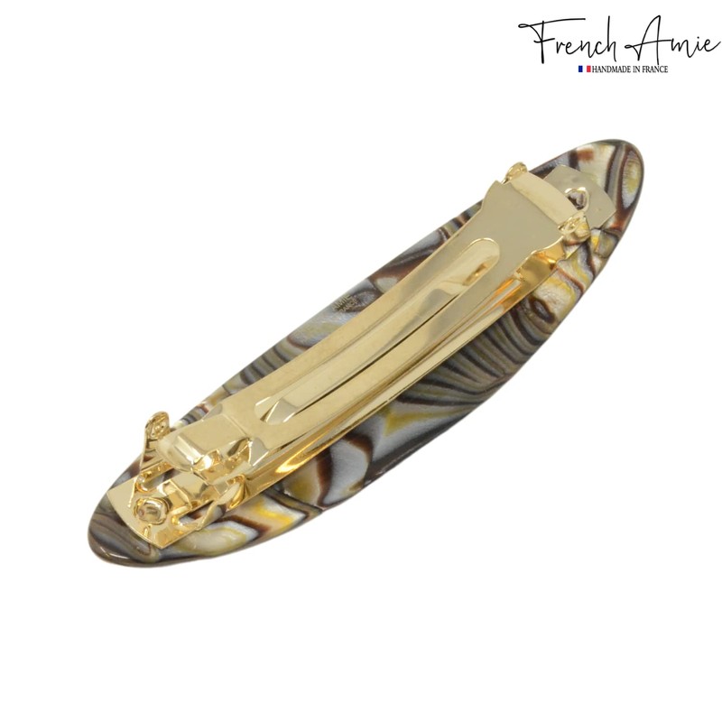 French Amie Slim Oval Celluloid Handmade Onyx Silver Grey Automatic Hair Clip Barrette with Golden Clasp