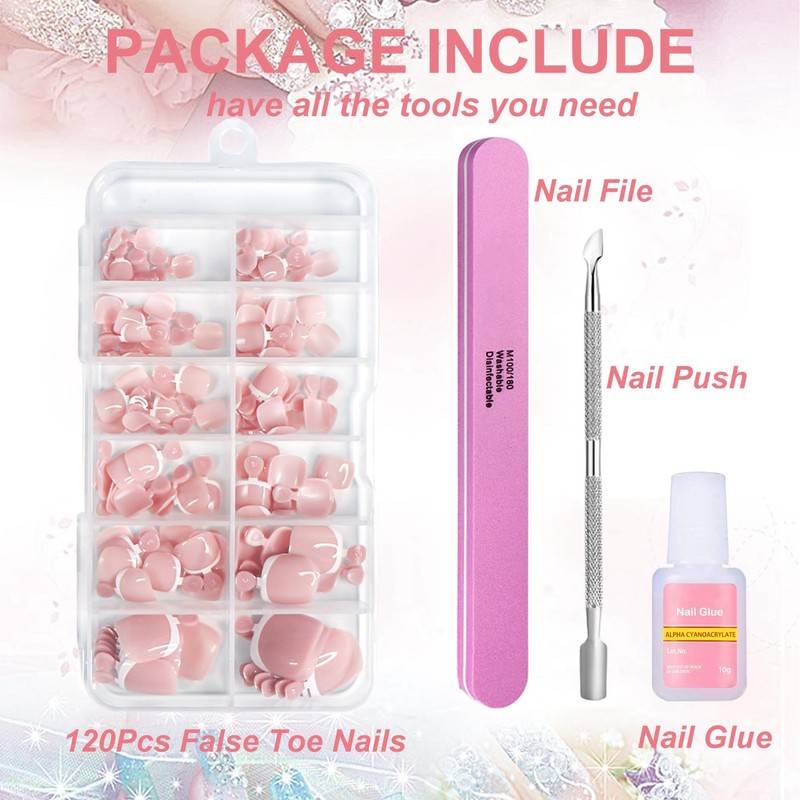 - 【FRENCH FAKE TOENAILS KIT】This False Toenails Kit includes 120pcs French style square press on nails and all necessary tools as nail files*1, stainless steels cuticle pusher*1, nail glue*1 and the box with press on nails. Prefect toenail set for DIY nail art at home, you can DIY your toenail decorations, making your tips charming and stylish.