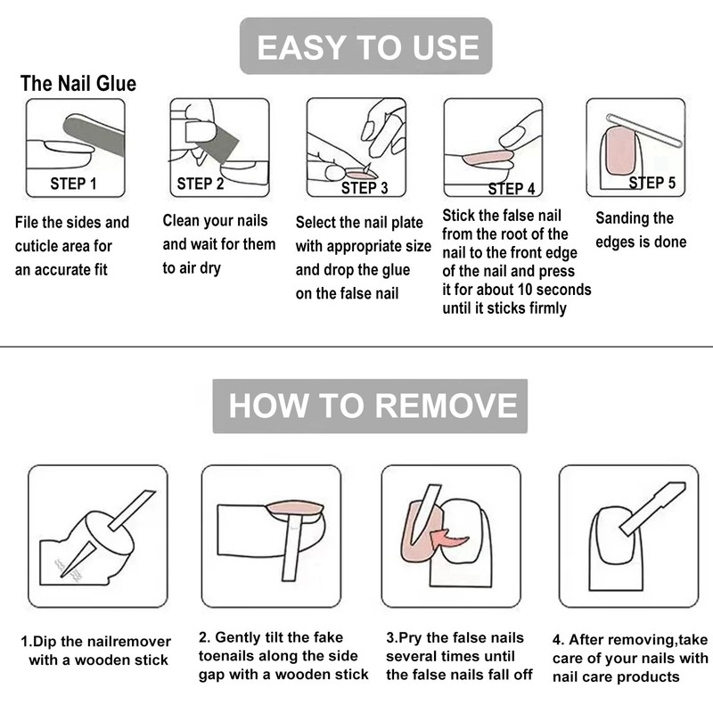 - 【FRENCH FAKE TOENAILS KIT】This False Toenails Kit includes 120pcs French style square press on toenails and all necessary tools as nail files*1, stainless steels cuticle pusher*1, nail glue*1 and the box with press on nails. Prefect toenail set for DIY nail art at home, you can DIY your toenail decorations, making your tips charming and stylish.