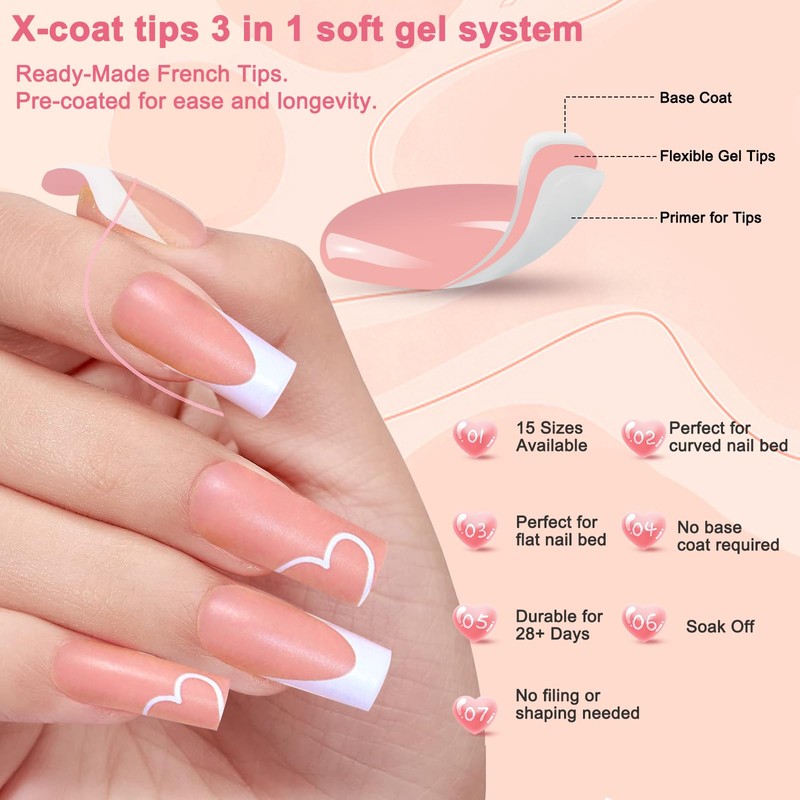 • 🎁[3-in-1 X-Coat Gel Tips] - Discover the innovation of our 3-in-1 X-Coat technology, where tip primer, French design, and base coat merge into our soft gel nail tips, including our xcoat press on nails and x coat tips press on nails french. This integration results in a coarser matte surface for gel x nail tips, ensuring a stronger bond with adhesive for press on nails and long-lasting wear.