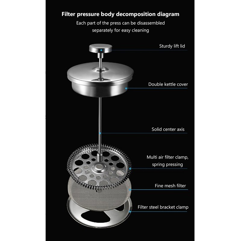 1、Heat Resistance: This coffee press pot has a sturdy structure and large capacity, and has a long service life of heat resistant stainless steel. 2、Filter Teapot: This French press coffee maker can retain the original aroma of coffee beans, and you don't need to worry about the residual coarse residue. 3、Multiple Purposes: It can not only make loose tea, but also ice tea, coffee, milk foam, etc., portable and can be heated, very suitable for camping and outdoor travel. 4、Fast and Easy Enjoyment: Use our coffee machine to brew a pot of delicious hot coffee in an instant, and enjoy delicious quickly and easily. 5、Easy to Clean: It is easy to clean your metal French press, it can be easily cleaned by hand or in the dishwasher, and is light in weight.