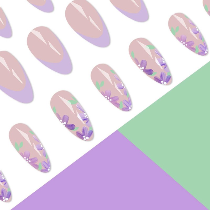 French Tip Press On Nails Almond Fake Nails Medium False Nails With Flower Design Purple Acrylic Nails Artificial Full Cover Nails Glossy Spring Glue On Nails Cute Stick On Nails For Women 24pcs
