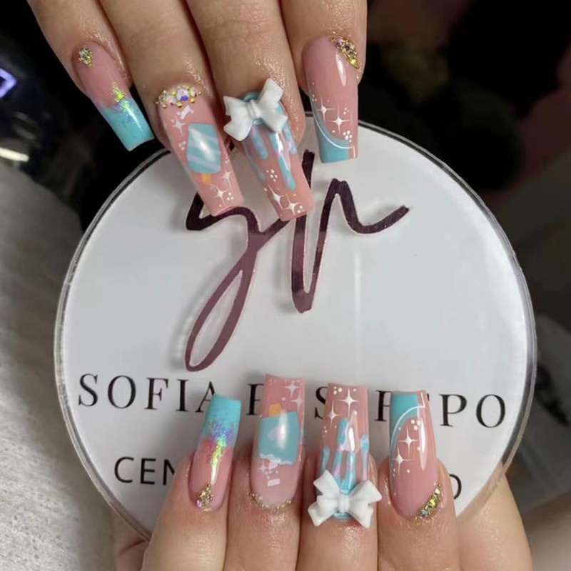 - 【Unique Design】:Pink Blue White Butterfly Design, Long Square Coffin false nails coffin, combine trendy elements with classic color and shape, shiny and attractive.