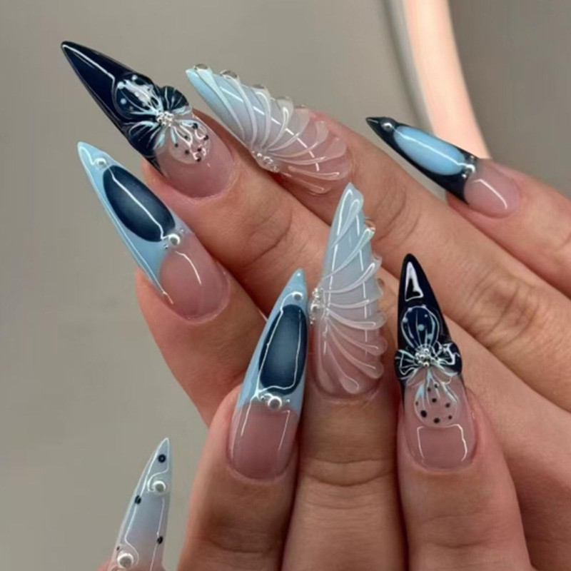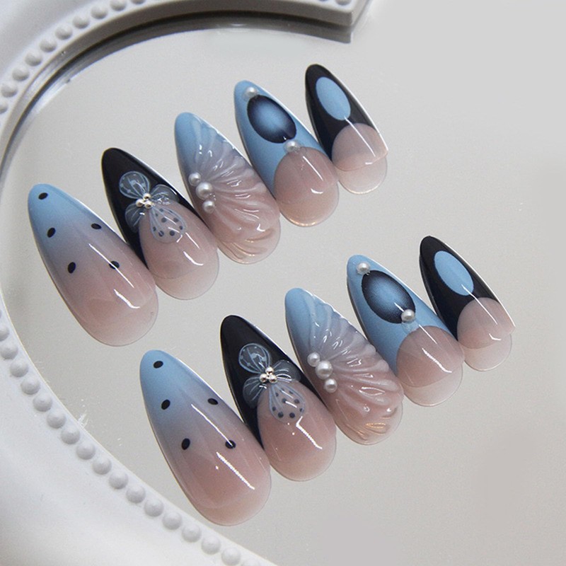 French Tip Press on Nails Medium Almond Fake Nails with 3D Flower Pearl Designs Blue Nails Press ons Glossy Glue on Nails Summer Acrylic Nails Gradient Artificial Stick on Nails for Women 24Pcs