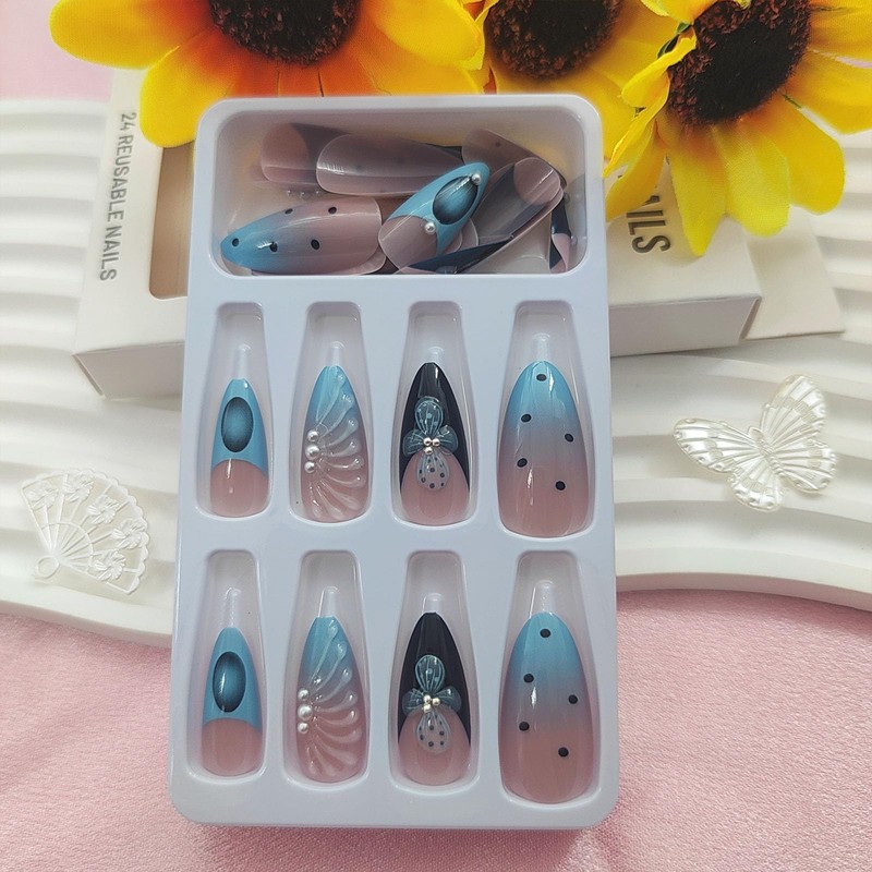 4. Choose medium press on nails of the right size, stick the acrylic nails on the jelly glue and press for about 25 seconds until it sticks firmly