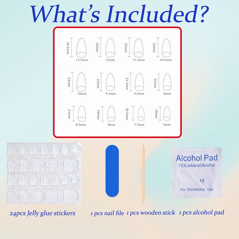 - 【Package Included】You will get 24pcs press on nails,1pcs jelly glue stickers,1pcs alcohol pad,1 nail file, 1 wooden stick.