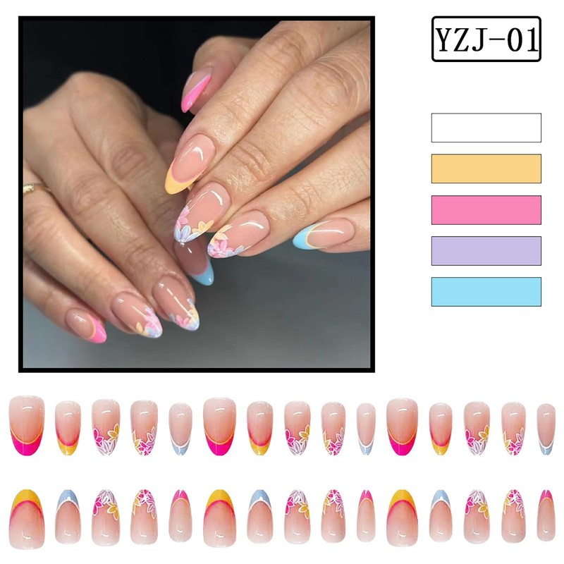 French Tip Press on Nails Medium Almond False Nails with Colorful Flower Designs Fake NailsSpecification