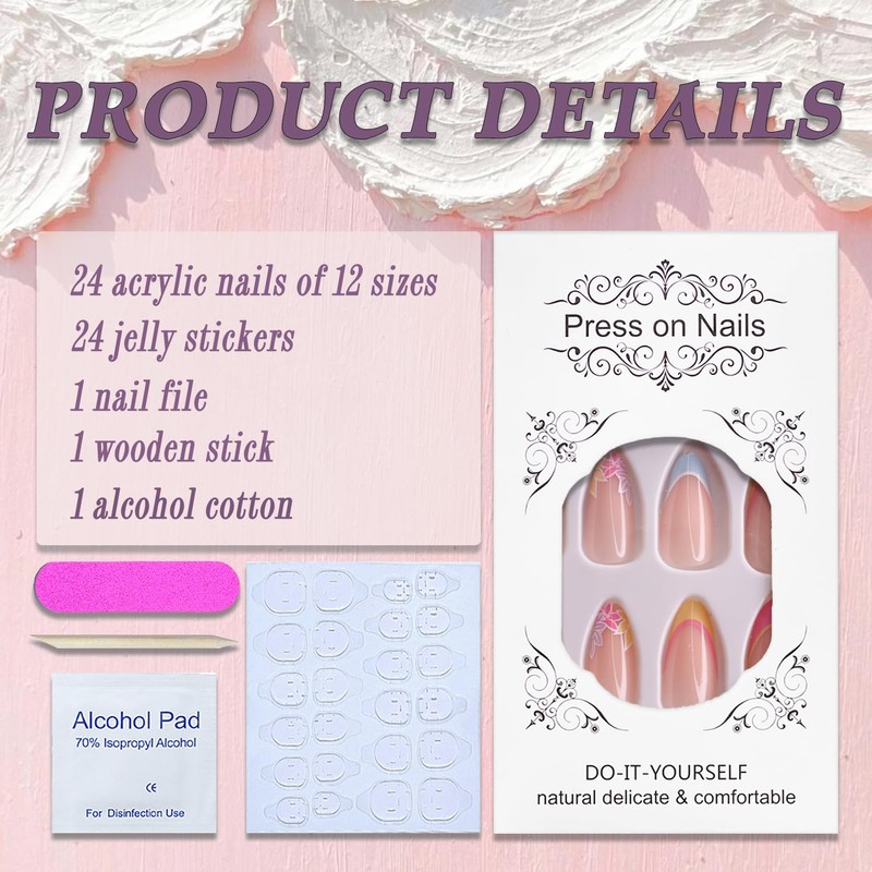 Package Contents: 24pcs false nails,24pcs Jelly glue, 1pc wood stick, 1pc mini nail file, 1pc alcohol pads.