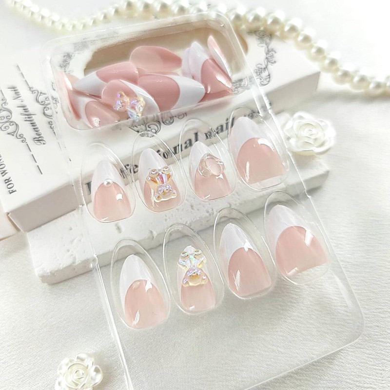 French Tip Press on Nails Short Almond Fake Nails with 3D Heart Shape Designs White Nails Press ons Glossy Glue on Nails Nude Acrylic Nails Artificial False Nails Cute Stick on Nails for Women 24Pcs