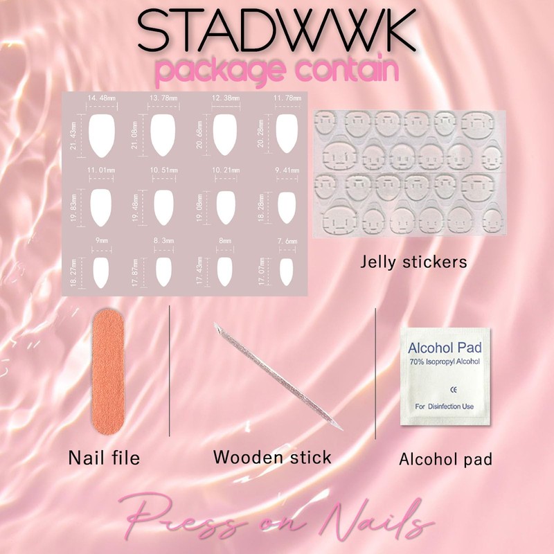 - Package Included: This almond press on nails short contains 24 pieces of 12 sizes of fake nails, 24 nails stickers,1 nail file, 1pcs alcohol pad, and 1 wooden stick for removing acrylic nails.