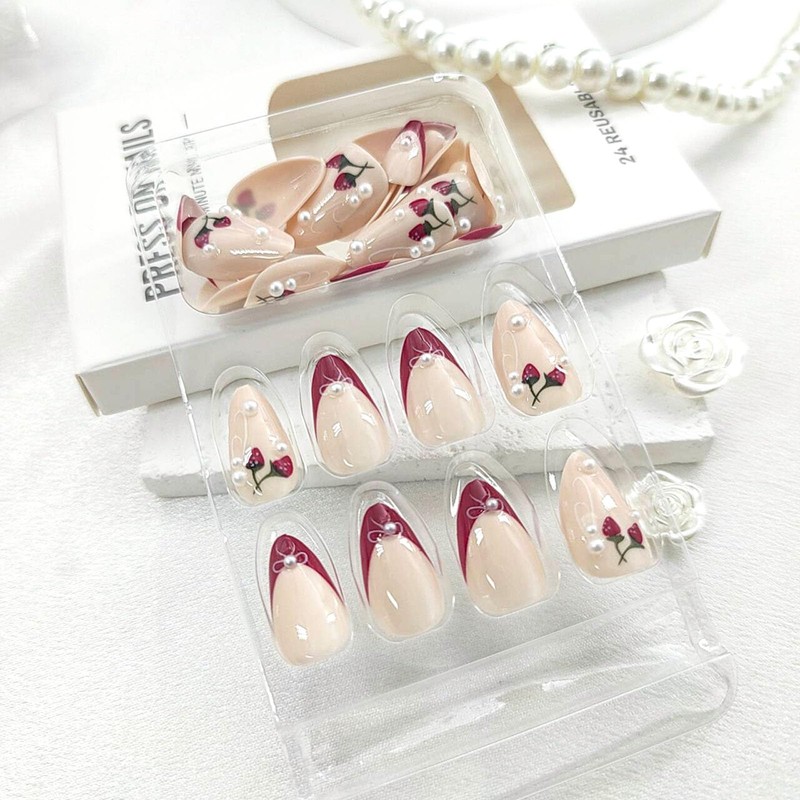 French Tip Press on Nails Short Almond Fake Nails with Pearl Bow Fruit Designs Red Nails Press ons Glossy Glue on Nails Nude False Nails Cute Acrylic Nails Artificial Stick on Nails for Women 24Pcs
