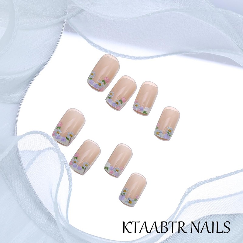 French Tip Press on Nails Short Square Spring Flower Fake Nails with Glue Nude Glossy Acrylic Nails Floral Stick on Nails Full Cover False Nails for Women Manicure 24PCS Reusable Artificial Nails