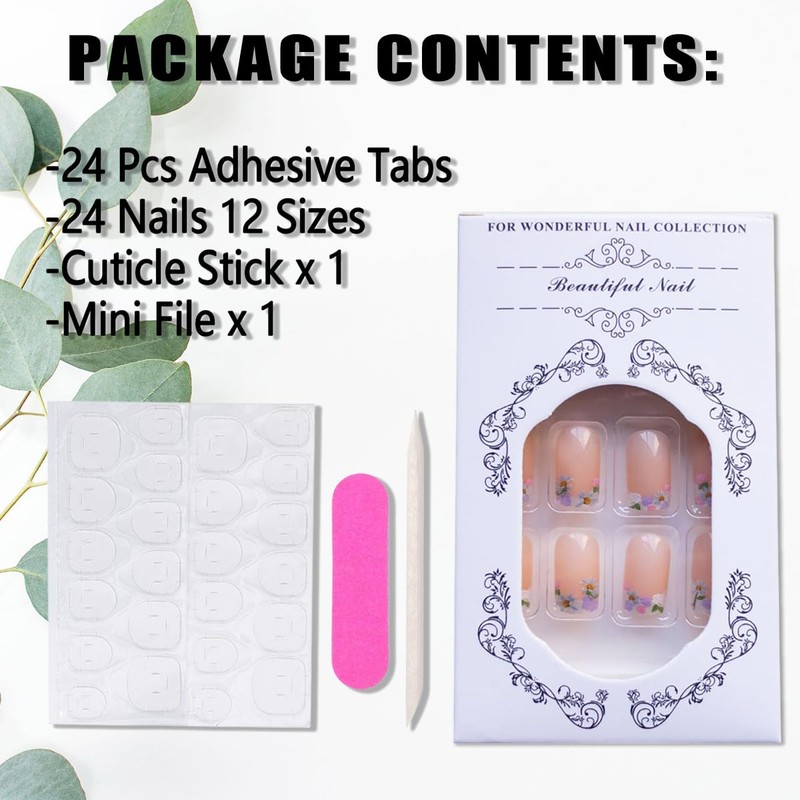 - Package Contents: 24pcs flower press on nails + 1 nail file + 24pcs jelly glue stickers + 1 alcohol cotton + 1 wooden stick. No matter the size or width of your nails, you can choose the most suitable false nails for yourself
