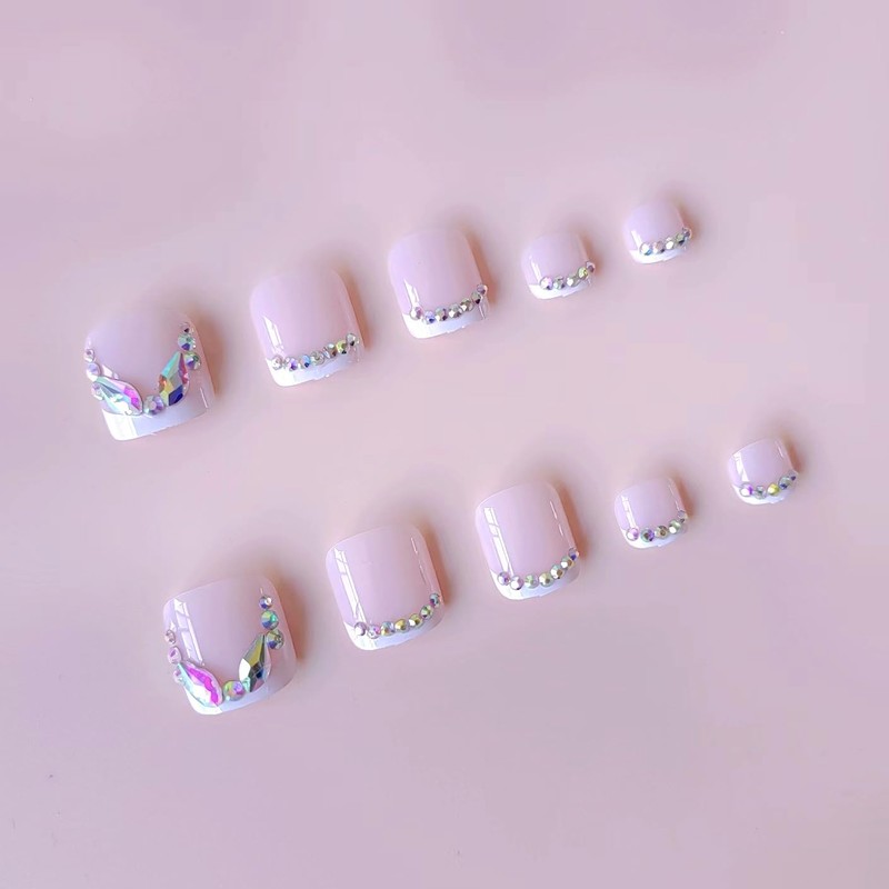 French Tip Press on Toe Nails Pink Fake Toe nails with Rhinestone Tip Designs False Toenails Square Glue on Toenails Shine Stick on Toe Nails Glossy Acrylic Toenails Full Cover Artificial Toenails