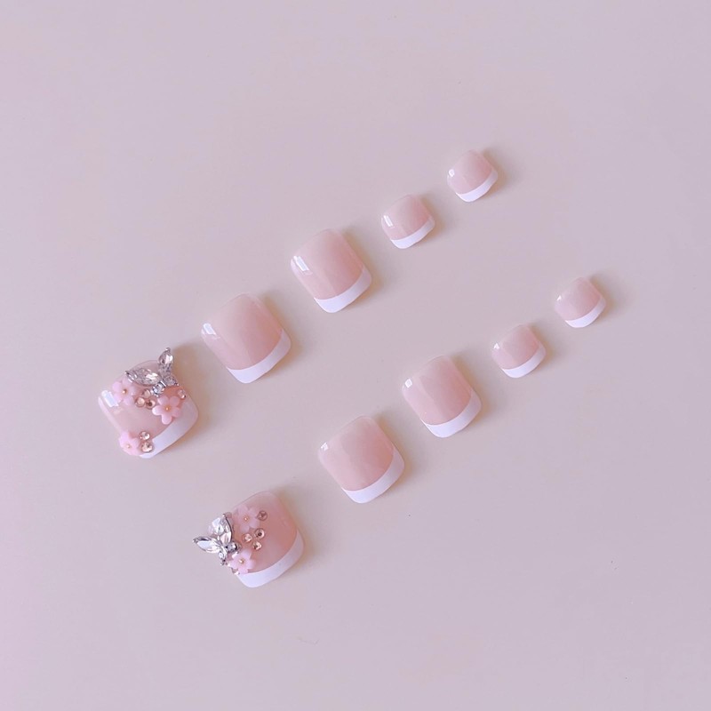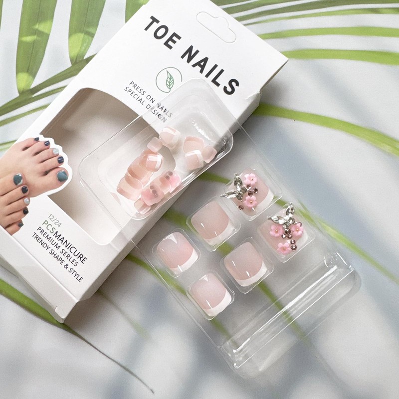 - One Minute Nail Tips: Choose the right size of false toenails to paste. Then apply the false nail glue and press it on the nails for a few seconds to complete the beautiful manicure.