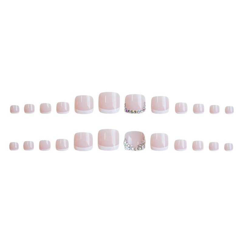 French Tip Press on Toenails White Full Cover Fake Toenails Short Square Summer False Toenails Charm Toe Nails Press ons with Elegant Rhinestone Border Design Glossy Toenails for Women Girls 24 Pcs
