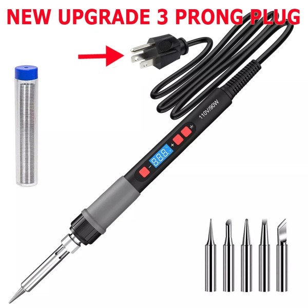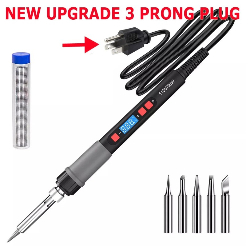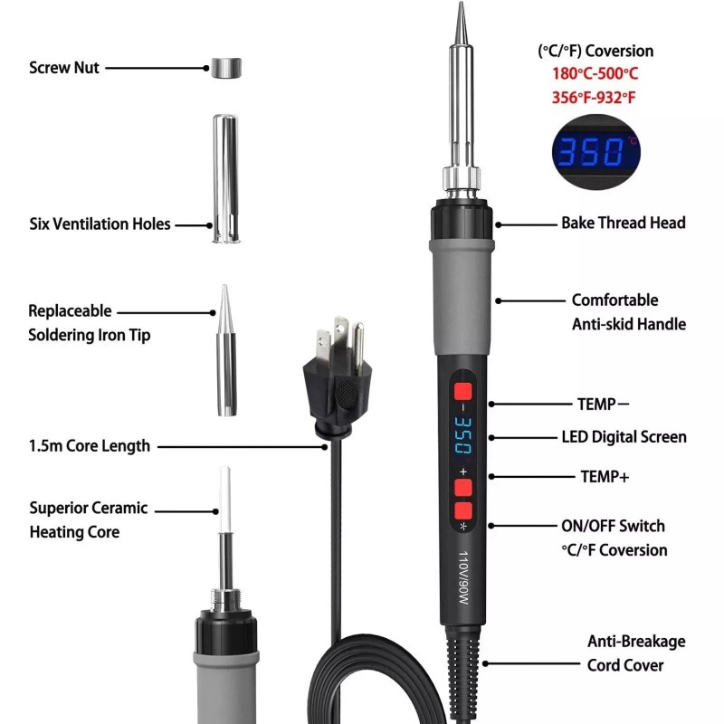 High Power & LCD Digital Display - 90w soldering iron precise shows adjustable temperature from 356℉ to 932℉ (180℃-500℃) through the LCD screen. Press and hold the "#" key for 3 seconds to power on, temperature "+" "-" key supports adjustment of every 1℃ and the "#" key supports a ℉/℃ switch