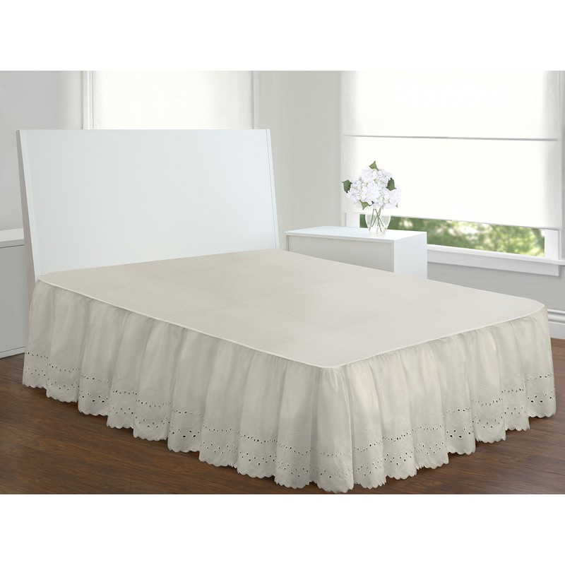 - Timeless Design: This bed skirt features a solid woven base with full ruffle trim. The ruffles have detailed eyelet embroidery and a scalloped edge