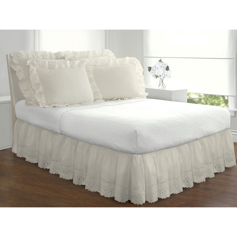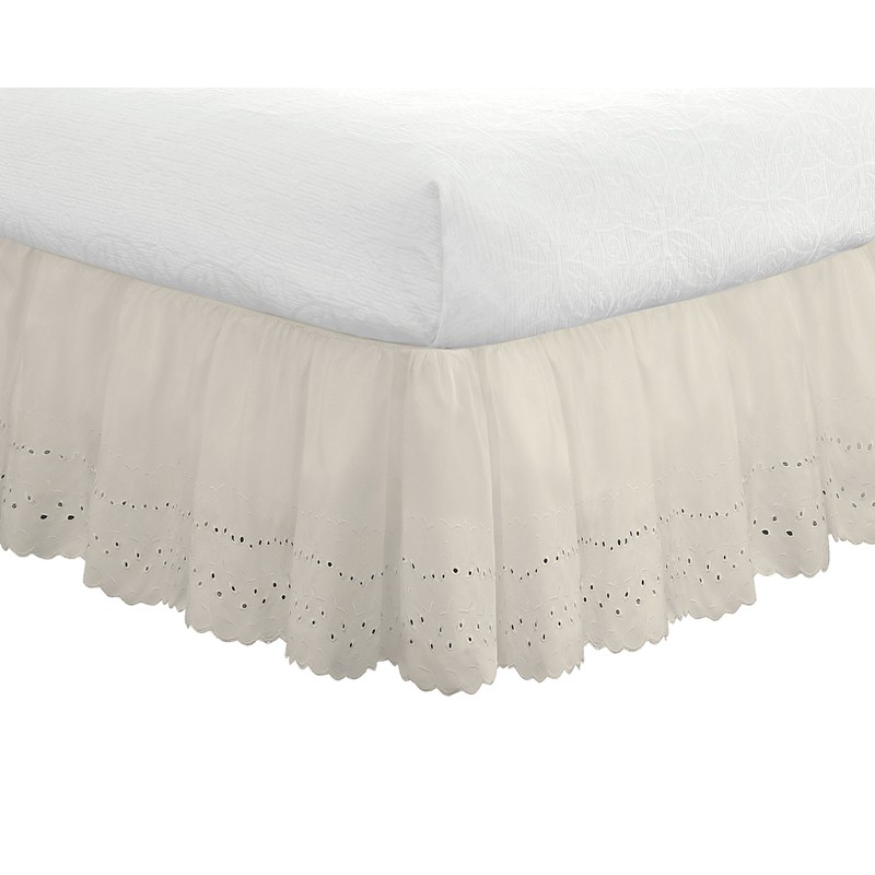 - Timeless Design: This bed skirt features a solid woven base with full ruffle trim. The ruffles have detailed eyelet embroidery and a scalloped edge
