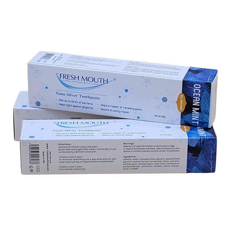 Over 95% of toothpastes utilize Fluoride to help fight germs in the mouth. However, Fluoride has been proven to have some strong side effects such as weight gain, depression, fatigue, and cognitive problems just to name a few. The FRESH MOUTH Toothpaste with improved formula uses nano silver technology that eliminates the germs in our mouths and shields us from ingesting any type of harmful substance. This special cleaning agent has also been found to aid in the repair of tooth decay, receding gums, teeth sensitivity, and bad breath while fighting against germs. With our amazing formula, you can take brushing to a whole other level making sure your mouth stays, Always Fresh / Always Clean.