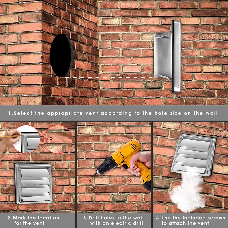 - 【Please note the diameter of this dryer vent is 3.8" and it can be fit in a 4" diameter pipe or hole】 Easy outdoor installation. Step 1: Put the rubber gasket onto the outer edge of the vent frame to minimize noise. Step 2: Insert the nozzle into the ventilation duct and the retainer clips can keep the vent in place. Step 3: Secure the vent with the four screws provided.