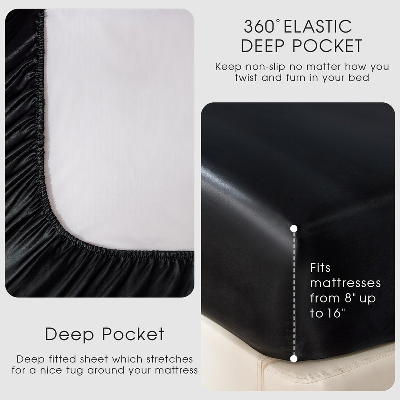 - Package Includes: Our king satin sheets set is made from 100% premium polyester satin for a luxurious feel. It includes 2 pillowcases (20" x 40"), a flat sheet (108" x 102"), and a fitted sheet (78" x 80") with full elastic and deep pockets for mattresses up to 16". Enjoy soft, skin-friendly comfort that enhances your bedroom decor.