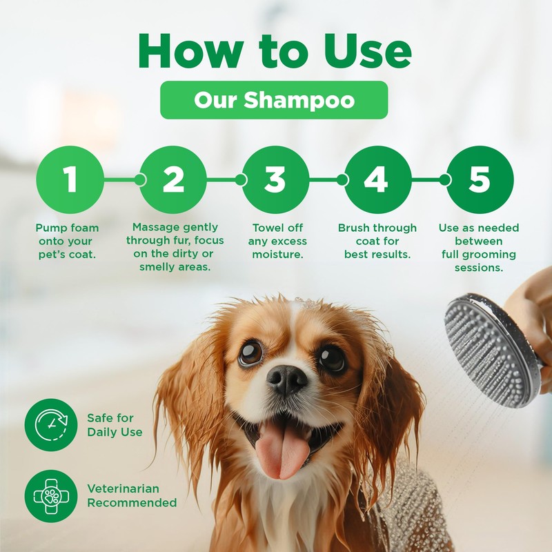 - EASY FOAM-ON APPLICATION - Mess-free, non-drip foam spreads evenly through fur and is easy to massage in. No spray bottles or soggy towels just pump, rub, towel, and brush. Quick drying with no sticky residue.