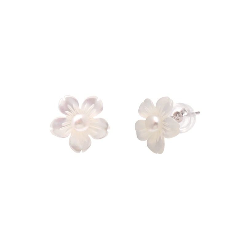 - This is a pair of hand carved white shell flower earrings studs, set with 4mm tiny freshwater cultured pearls in center