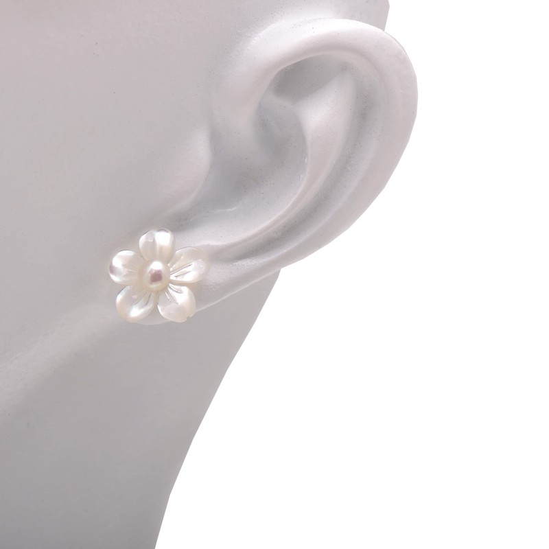 Freshwater Cultured Pearl Studs Hand Carved Shell Flower Earrings for Women, White