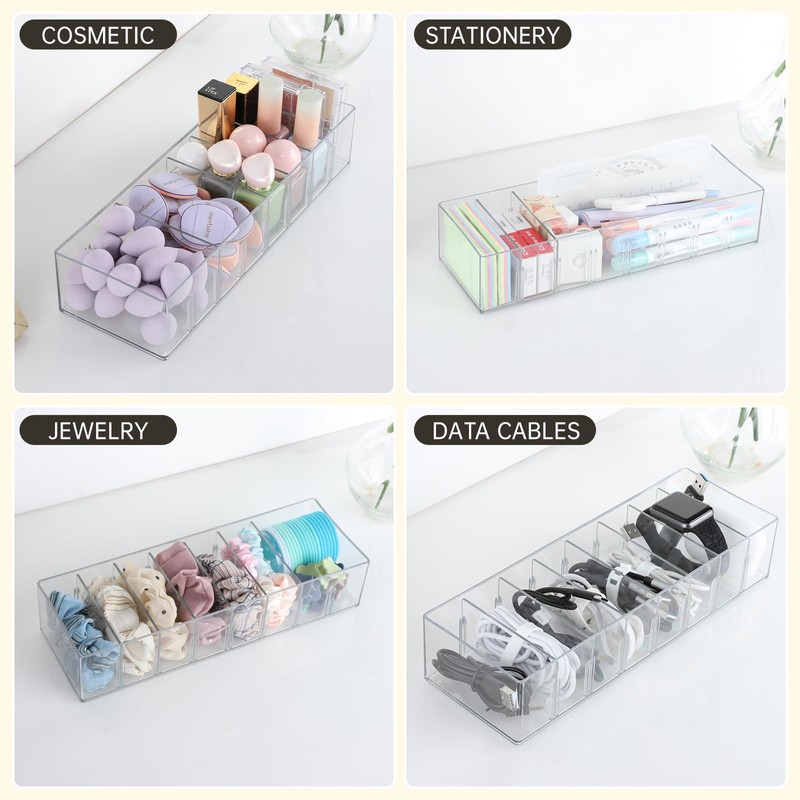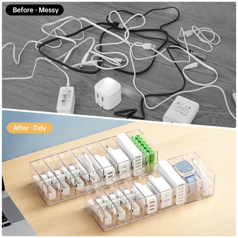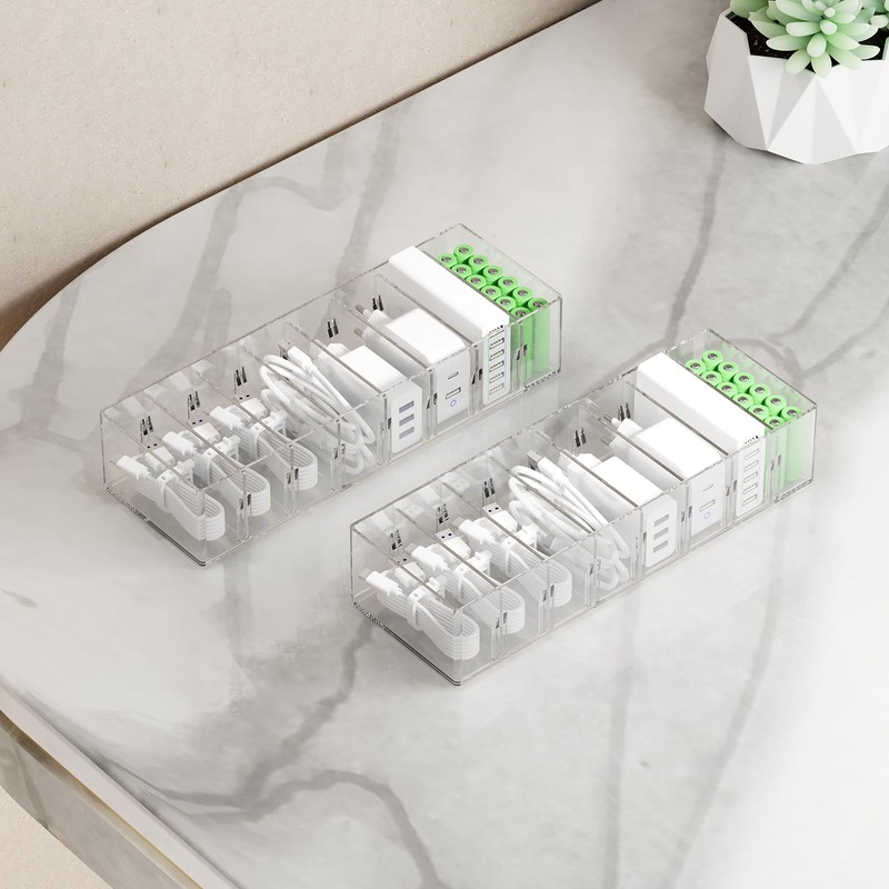 - Durable and robust: cable organiser with adjustable compartments made of high-quality PET, transparent, durable and durable, our cable management box set is practical and easy to clean and stores all your small desk accessories, saves space and ensures order on desks and drawers.