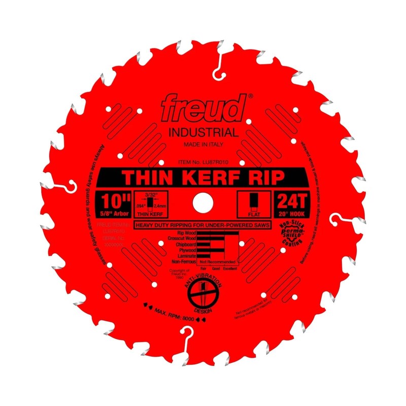 Amazon.comThe 10-inch Freud LU87R010 Thin Kerf Rip Saw Blade makes quick work of ripping operations in hard- and softwood. It features 24 flat, oversized teeth with thick TiCo high-density carbide tips designed to last, in addition to Freud's Perma-SHIELD coating, which reduces friction to prevent heat buildup. Plus, since it's a thin-kerf blade, it wastes less material and continues to cut cleanly when used with underpowered saws.Large-Tooth, Thin-Kerf Blade Ideal for Low-Horsepower SawsThis rip saw blade is ideally suited to ripping hard- and softwoods, and it also delivers strong results when crosscutting wood or working with plywood. Ideal for working with materials that are 3/4 to 2-3/4 inches thick, the blade can also handle thinner or thicker materials, and it can be used to cut chipboard or laminates. However, some loss of surface finish may occur when it is used outside its ideal range. It has a 5/8-inch arbor and produces a 0.094 kerf.In addition to offering faster cuts through tough materials, its large tooth design allows the blade to be safely sharpened more times, prolonging the life of the blade and saving you money. Plus the large gullets between these teeth ensure easy chip removal.Well-Balanced, Anti-Vibration DesignThis Freud blade is pretensioned for truer cuts under heavy loads. It also features an anti-vibration design that reduces chatter for a cleaner finish, longer blade life, and reduced noise while you work. And because the blade is laser cut from high-strength steel, you can trust that it will stay stable, flat, and true, even after prolonged use.High-Density Carbide for Maximum Cutting PerformanceThis thin-kerf rip saw blade's 24 teeth are finished with tips made from an application-specific TiCo high-density carbide "ripping blend" that offers improved density, hardness, corrosion resistance, and heat resistance.Ideal for the demands of ripping large quantities of thick, hard wood, this carbide blend includes extra cobalt for increased impact resistance. Plus, it delivers increased sharpness and edge retention, which means the blade will hold up longer--saving you money.Perma-SHIELD Coating Reduces Friction and Heat BuildupBuilt to withstand tough use in less-than-ideal conditions, this blade is finished with Freud's red Perma-SHIELD--a non-stick coating that reduces friction and nearly eliminates the heat buildup that excess friction can cause. By providing complete thermal insulation, this coating protects your tools and your work surface. And it resists binding when the blade is used for large-volume cutting applications, which reduces blade warp.As a lubricating feature, Perma-SHIELD allows the blade to spin freely while reducing stress on the motor and carriage of your saw. In addition, this coating helps prevent debris collection and resin or "pitch" buildup. Since gummy pitch buildup causes extra drag on the motor of your saw, less buildup is another little convenience that translates into longer tool life and longer blade life. It also means less downtime for blade cleaning, so you get jobs done faster.This industrial saw blade is backed by Freud's limited lifetime warranty.About Freud: A History of Innovative ManufacturingAn industry leader for more than 50 years, Freud America, Inc. is a manufacturer and marketer of superior carbide cutting tools for the woodworking industry. Freud is one of the few manufacturers of woodworking tools in the world that produces its own MicroGrain Carbide with Titanium, called TiCo, a high-density combination of Titanium and Cobalt.By producing their own carbide, Freud has the unique ability to formulate each tool for each specific application, thereby maximizing the cutting life and performance of the tool. Freud's full line of high-quality, woodworking tools includes saw blades, router bits, shaper cutters, power tools, and more.What's in the BoxFreud LU87R010 Thin Kerf Rip Saw Blade--10-inch diameter, 5/8-inch arbor, 24-tooth design.Product Description10" x 24T Thin Kerf Rip BladeFrom the ManufacturerThis blade gives new life to underpowered table saws and radial arm saws because the thin kerf does not require much horsepower. The ideal working range is 3/4" tp 2-3/4". This blade features Freud's Tico Hi-Density Carbide, Non-Stick Perma-Shield Coating, Laser cut anti-vibration slots, Anti-kickback design, and Tri-Metal brazing make this blade ideal for heavy-duty ripping on saws under 3 HP.