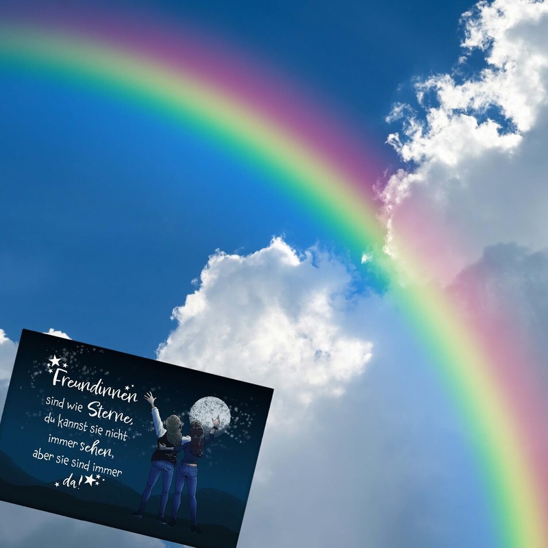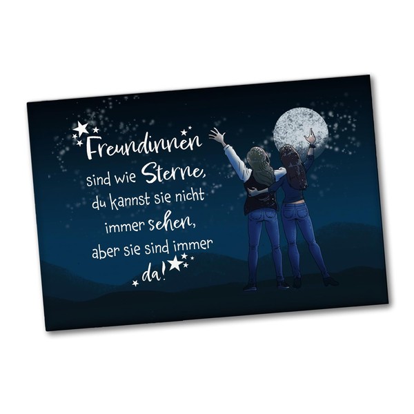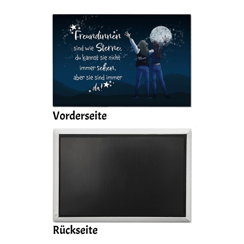- The magnet says "Freundinnen sind wie Sterne, du kannst sie nicht immer sehen, aber sie sind immer da! On the right you can see two friends at night looking at the starry sky.