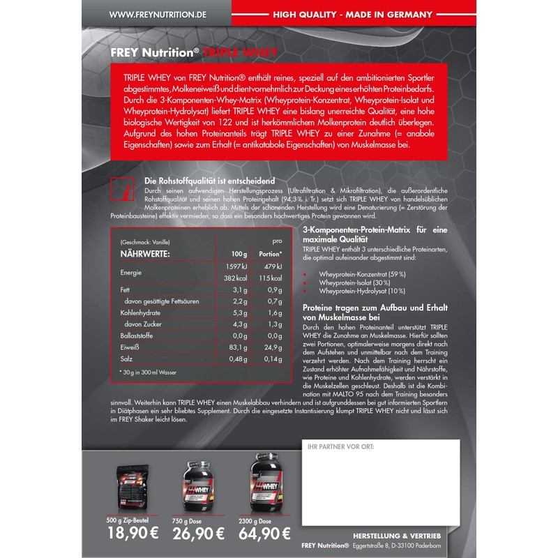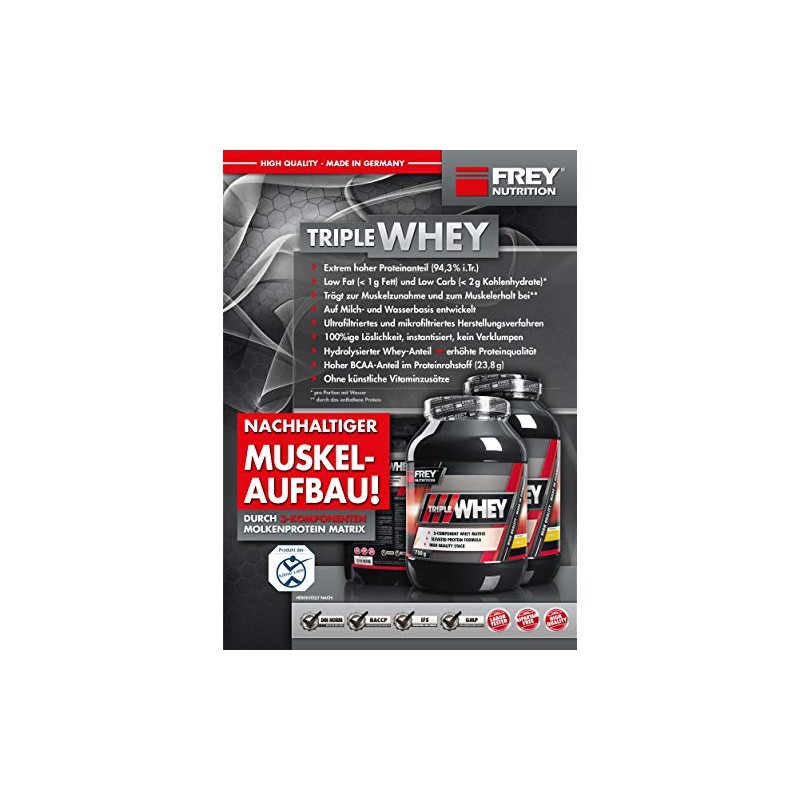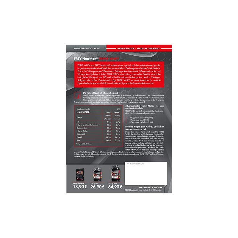 Thanks to the high protein content, Triple Whey supports the increase in muscle mass. In combination with Malto 95 immediately after training, Triple Whey unfolds its full effect. Furthermore, Triple Whey can prevent muscle loss and is a very popular supplement for well-informed athletes in diet phases. Thanks to the instantisation used, Triple Whey does not clump and can be easily removed in the Frey shaker.