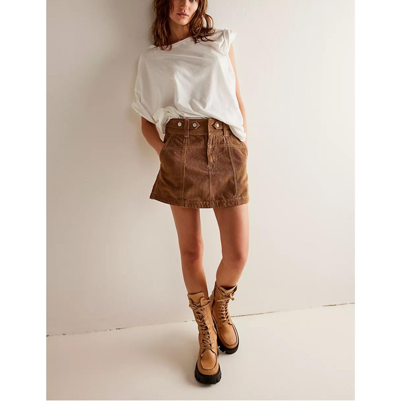 Freyhem Womens Corduroy High-Rise A-line Silhouette Mini Zip Placket Button Loop Closure Skirt with Pockets(Brown-S)