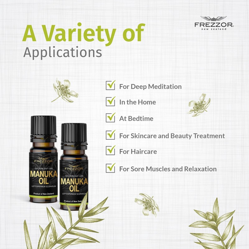 - FREZZOR East Cape Manuka Essential Oil is a 100% pure, steam distillation of the powerful bioactive compounds found in the Manuka flowers, leaves and stems of the New Zealand Manuka tree. (Leptospermum scoparium) Manuka oil (also known as the New Zealand Tea Tree).
