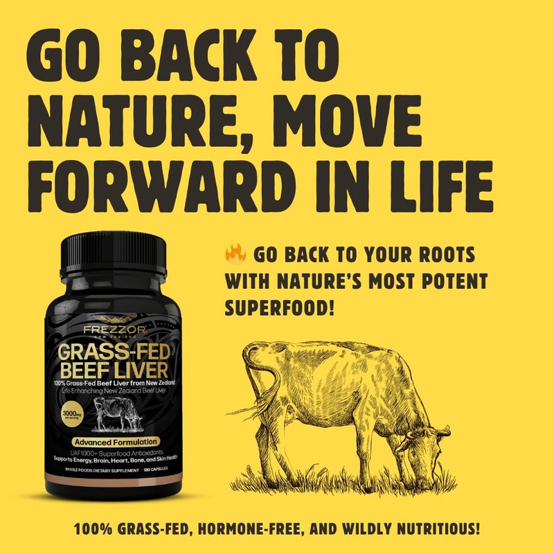 FREZZOR New Zealand 100% Live-Grass-Fed Beef Liver 180 Capsules, Supports Energy Production, Detoxification, Digestion, Immunity and Full Body Wellness, Non-GMO, 3000mg