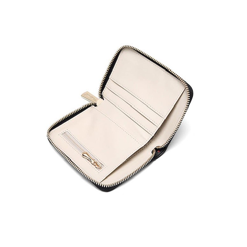 - An inside zip pocket, two credit card slots, and a bill compartment.