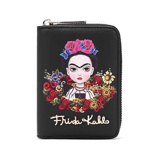 Frida Kahlo Cartoon Flower Collection Cute Zip Wallet (Black)
