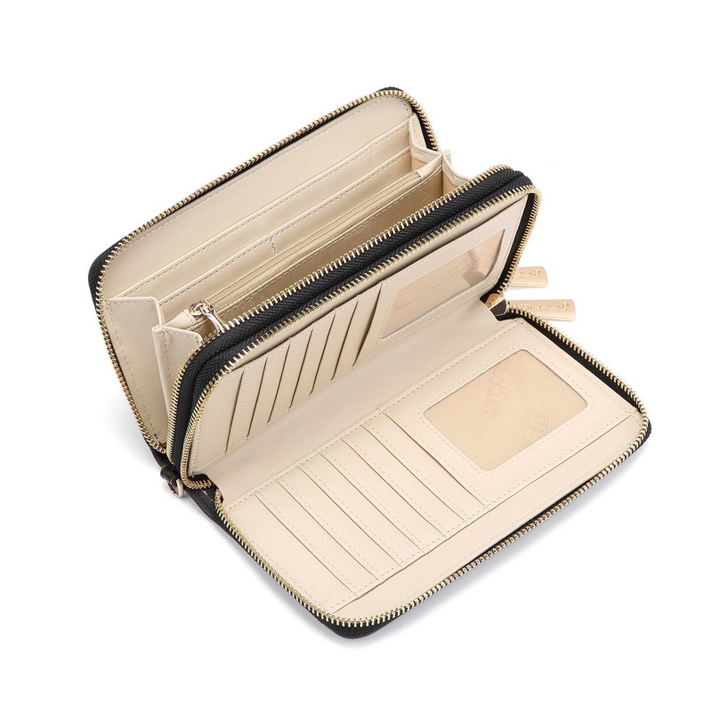 - Efficient Storage: Front Zipper Pocket Has Two ID Slots, 10 Card Slots, Two Checkbook Slots. Back Zipper Pocket Has Two Checkbook Slots, 8 Card Slots, One Middle Zippered Pocket for Coins/Small Items. Additional Zippered Pocket in the Back of the Wallet.