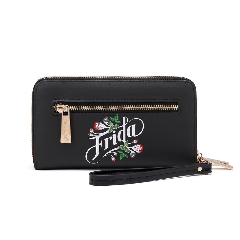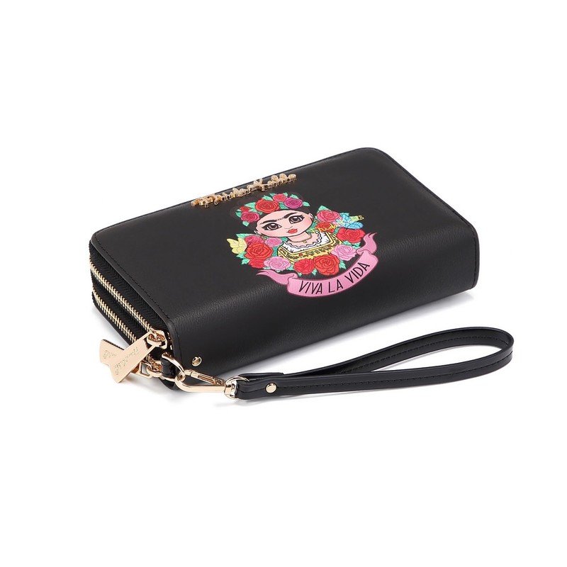 Frida Kahlo Cartoon Zip Around Wallet with Wristlet (Black/Black)