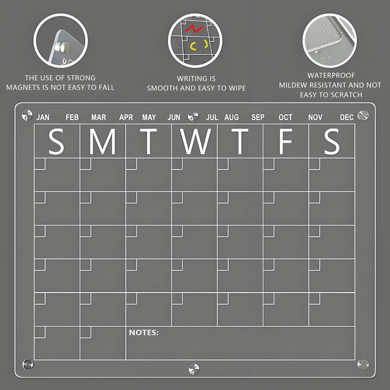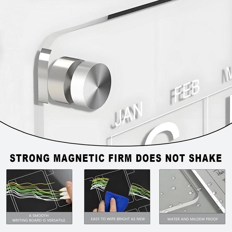 - Magnetic, No Drilling: 6 pcs strong 0.15 in extra-thick magnets enable the Fridge Magnet Calendar to stick firmly to metal surfaces and most refrigerators; This erasable board will never slide down or damage your refrigerator . The grip is very strong, and it doesn't move or slide over long periods of use.