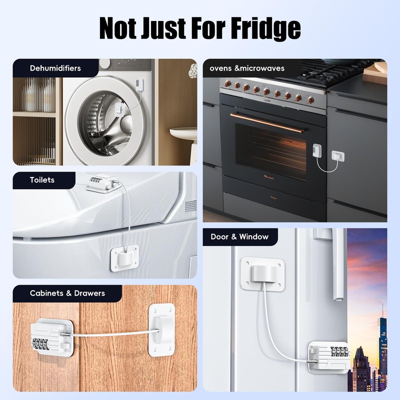 • Multifunctional Password Lock:Not only can be used for refrigerators, but also for cabinets, hot air fryers, toilets, windows, drawers, cabinets, washing machines, etc. A safety lock provides safety for children and pets.