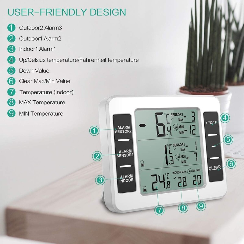 - Dual wireless sensors for different places: with built-in console and 2 remote sensors, the wireless fridge thermometer can simultaneously display the indoor temperature and 2 groups of the outdoor temperature. You can use it in the fridge, freezer or outdoors. It provides safe storage of food and allows you to live a healthy life.