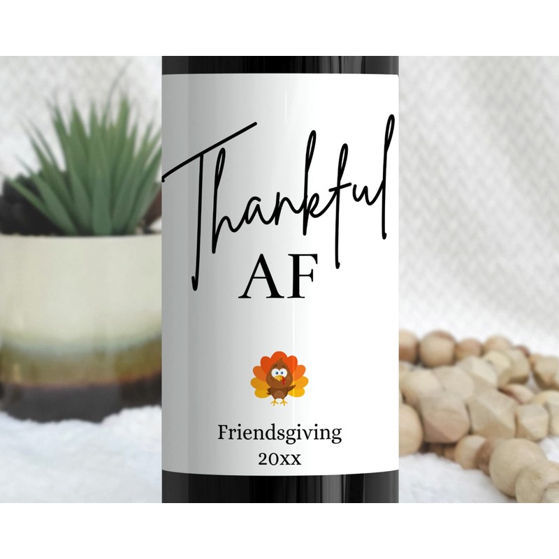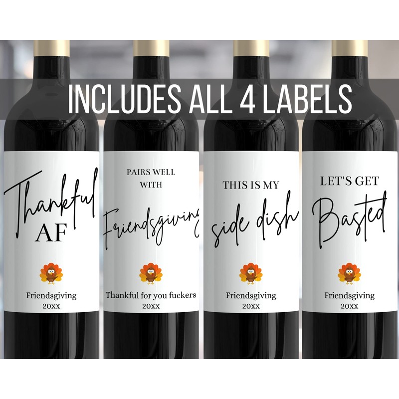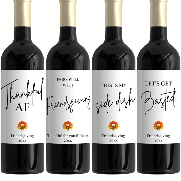 Friendsgiving Wine Bottle Label Stickers Set of 4 Funny Custom Hostess Gift Thankful AF This is My Side Dish Pairs Well with Friendsgiving Thankful for You