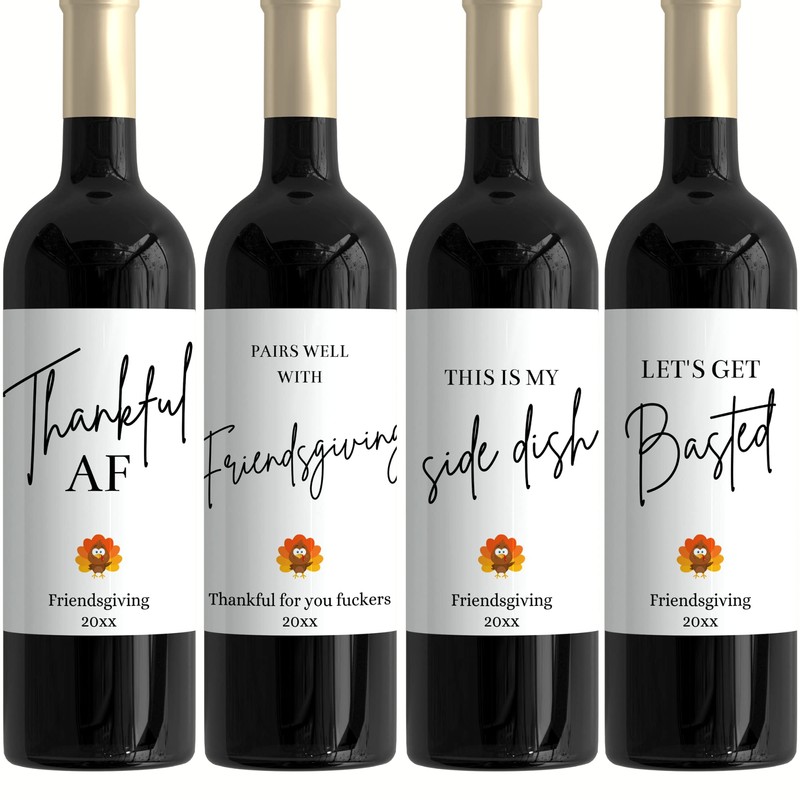 Friendsgiving Wine Bottle Label Stickers Set of 4 Funny Custom Hostess Gift T...