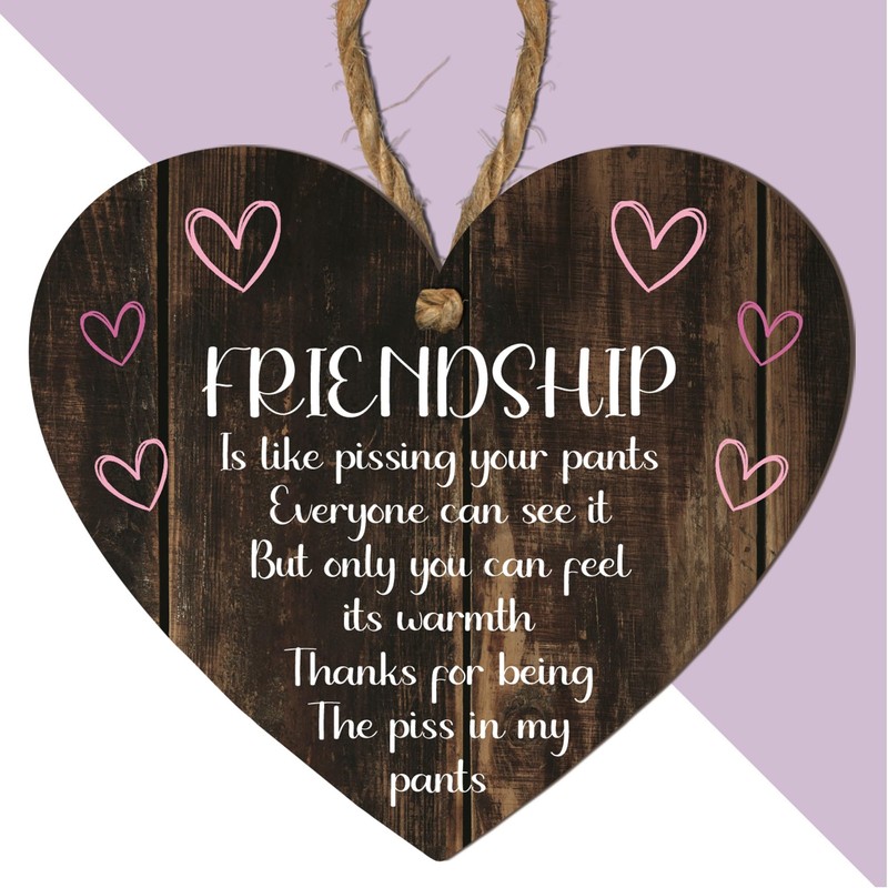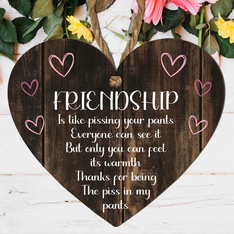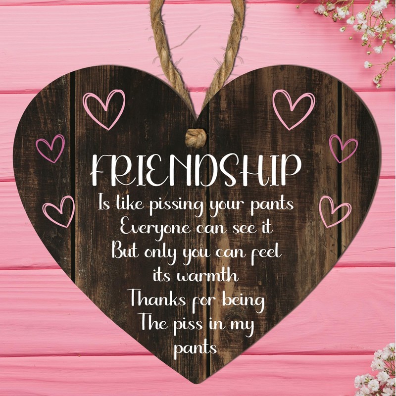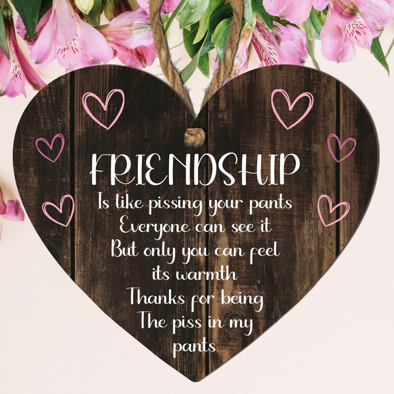 - 😂 Hilarious Friendship Quote: This MDF hanging heart plaque features the funny and relatable quote, 'Friendship Is Like Pissing Your Pants,' adding humor to any room. Featuring the quote "Friendship Is Like Pissing Your Pants: Everyone can see it, but only you can feel its warmth. Thanks for being the piss in my pants," this plaque is sure to bring joy and laughter to anyone who sees it.