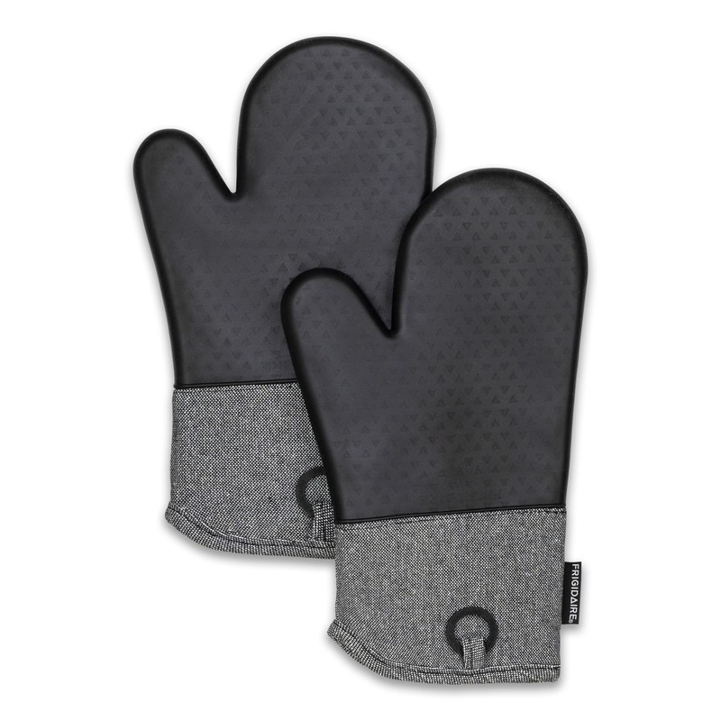 Frigidaire Sasha Cotton and Silicone Oven Mitts, Heat Resistant, Anti-Slip, Machine Washable, 13”x 7 “,Black, Set of 2