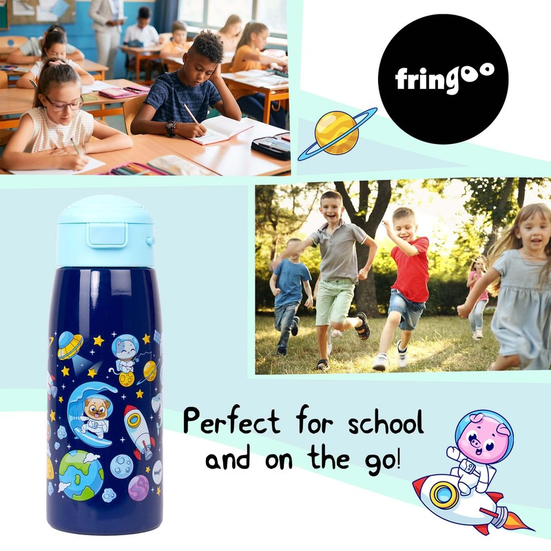 Fringoo 350ml Kids Water Bottle with Straw Stainless Steel Bottle,Insulated Double Wall, 100% Leakproof and Lockable, Carry Handle, 12hr temp control, Blue Space Design